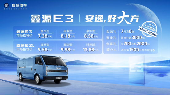 鑫源E3作為“安逸,好大方”全新車型,共推出鑫源E3、鑫源E3L兩個(gè)車型,分別有基礎(chǔ)型、標(biāo)準(zhǔn)型、豪華型、科技型等6款配置,指導(dǎo)價(jià)7.38萬元-13.88萬元。上市還推出新車上市權(quán)益包:1、金融禮-7萬真0息;2、置換禮-置換補(bǔ)貼3000元;3、金喜禮-交200抵2000元;4、暖心禮-送價(jià)值1500元全車鋁地板。鑫源E3以“一寸長·一寸強(qiáng)”、“移動(dòng)家·頭等艙”和“好·省”三大核心賣點(diǎn),為新能源城配物流樹立新標(biāo)桿!