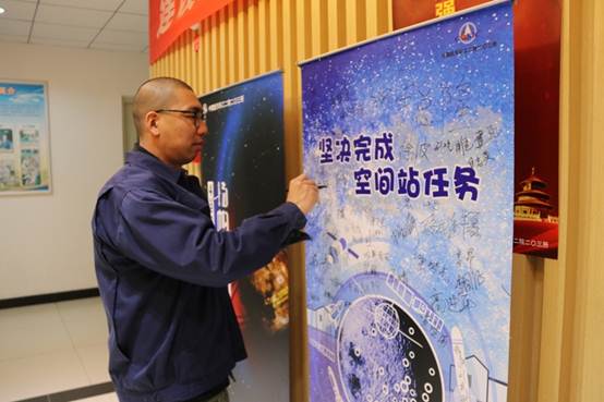 職工在“堅(jiān)決完成空間站任務(wù)”海報(bào)上留言