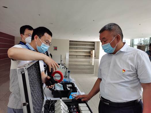 工程師向省市場(chǎng)監(jiān)管局黨組成員、副局長(zhǎng)李澍田講解交換電站漏電檢測(cè)系統(tǒng)的工作原理