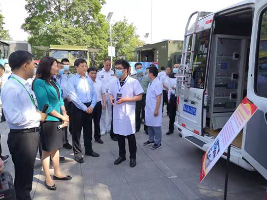 工程師為河南省副省長(zhǎng)霍金花講解新能源汽車(chē)供能裝置檢測(cè)移動(dòng)實(shí)驗(yàn)室